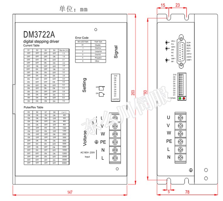 | 4 | DR- | DP9= OFF, DR為方向控制信號 | 用于改變電機轉向。要求:低電平0-0.5V,高電平4-27V,脈沖寬度>2.5μS | |