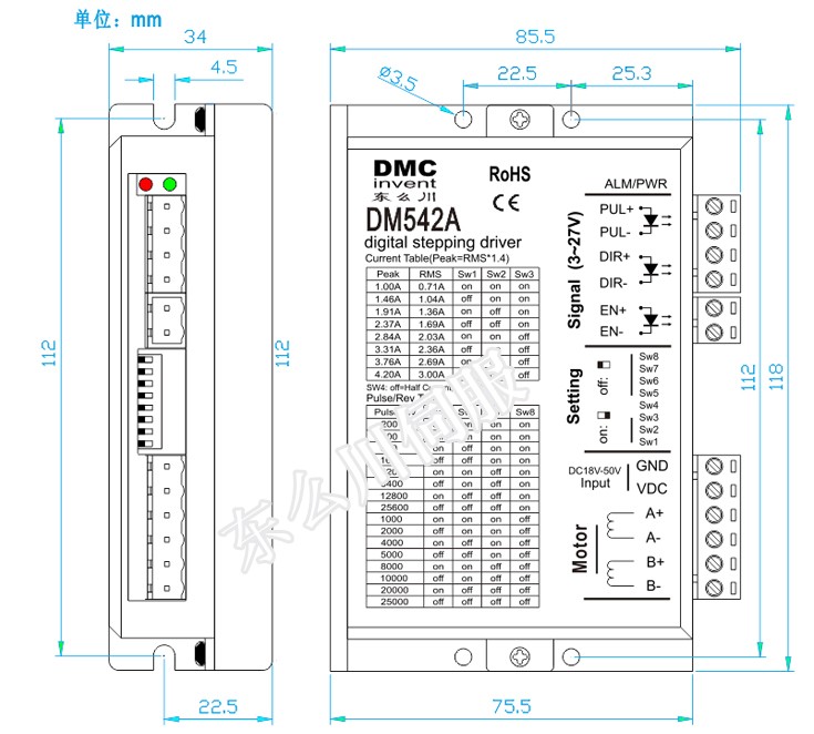 DM542A型驅(qū)動(dòng)器,比M542 具有更低的電機(jī)發(fā)熱、運(yùn)行噪聲和更高的平穩(wěn)性,以及更低的成本,主要驅(qū)動(dòng)42、57型兩相混合式步進(jìn)電機(jī)。其微步細(xì)分?jǐn)?shù)有15種,最大步數(shù)為25000Pulse/rev;其工作峰值電流范圍為1A-4.2A,輸出電流共有8檔,電流的分辨率約為0.45A;具有自動(dòng)半流,過壓和過流保護(hù)等功能。本驅(qū)動(dòng)器為直流供電,建議工作電壓范圍為24VDC-36VDC,電壓不超過50VDC,不低于20VDCd