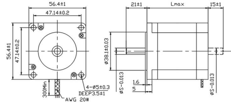 | 型號 | 步距角 (度) | 額定電壓(V) | 額定電流 (A) | 相電阻 (Ω) | 相電感 (mH) | 保持轉矩 (N.M) | 轉子慣量 (g.c㎡) | 機身長 (mm) | 軸徑 (mm) | 引線數 |