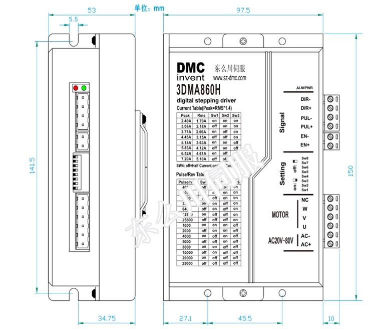 3DMA860H 產品是東么川公司采用先進的 DSP 控制芯片與獨特的控制電路結合一起所構成的新一代智能數字式細分型步進電機驅動器。基于精密的PID 電流控制算法設計,高速大力矩輸出。靜止時動態電流自動減半,使電機溫升大為降低,最大限度發揮電機的性能。用戶可以設置1~128 細分。低、 中、高速運行都非常平穩,幾乎沒有振動和噪音,完全解決了步進電機低速振動和噪音的缺陷。驅動器內部集成了參數自動調整功能 , 能夠針對不同參數電機自動生成最優的運行參數。